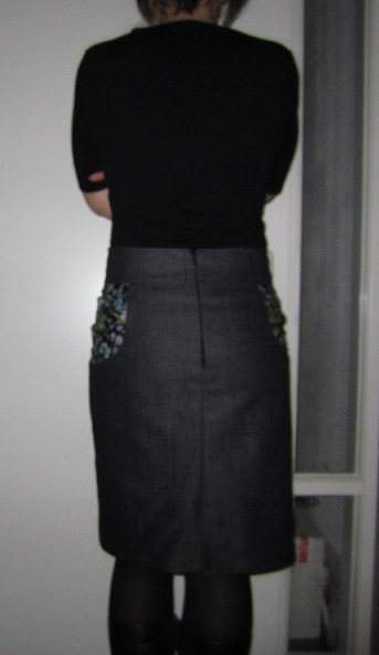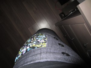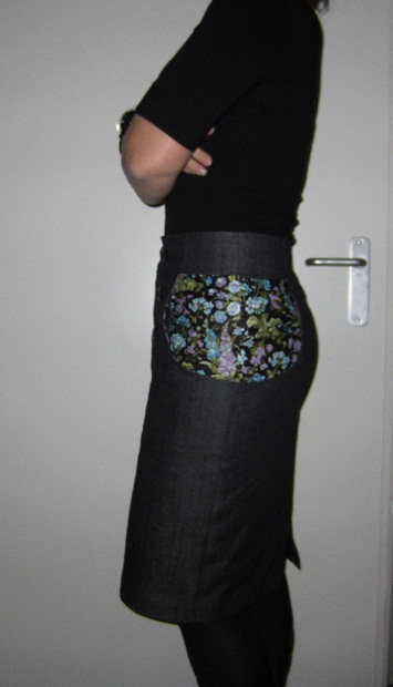 Zwarte spijkerstof en de heupstukken van het bloemetjesstofje waar ik nog wat van overhad na dit rokje.