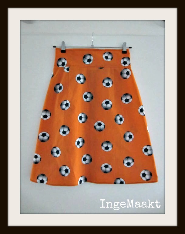 Informatie van huishoudelijke aard: het patroon is hetzelfde als dit rokje, alleen paste ik het aan met behulp van het patroon van dit rokje, zodat het meer een a-lijn werd. Ik ben over het model best te spreken eigenlijk, en ik kan me zo voorstellen dat ik hier nog wel een exemplaar van ga maken. Een serieuze dan, die ik wat vaker aan kan dan deze. Al hoop ik natuurlijk dat ik deze dit EK héél vaak kan dragen!