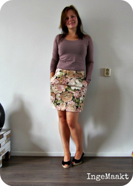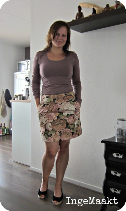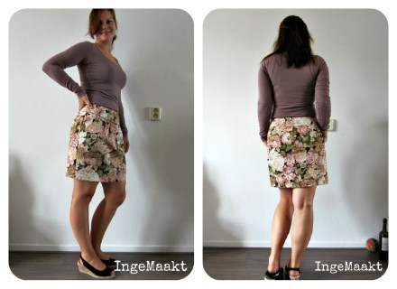 Het vorige rokje was wat aan de grote kant. Dat heb ik heel simpel opgelost door bij de zijnaden in plaats van de in het patroon opgenomen 1,5 cm naadtoeslag de naad op 2 cm te naaien. Nu is ‘ie precies op maat. Ik denk echter wel dat als ik dit patroon nog een keer maak (en die kans zit er dik in) en het is een stretchstof, er nog wel een klein stukje af kan. Maar voor een stof zonder stretch is dit helemaal goed.
