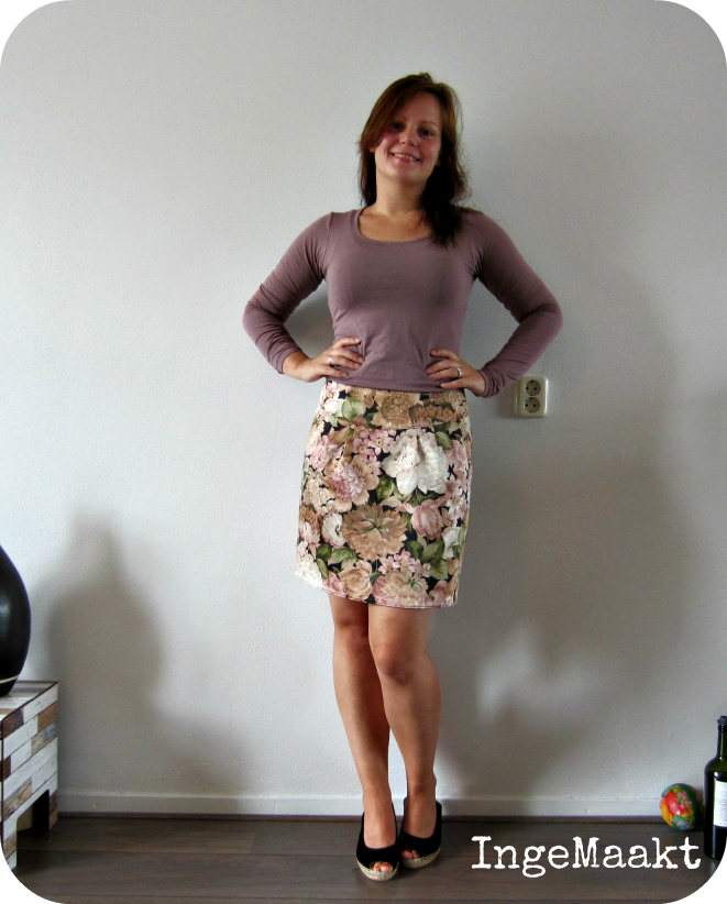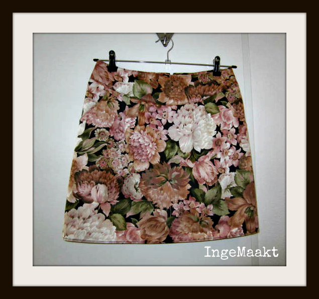 Wat verder nog ter tafel komt… en wat eraf! Het tweede rokje dat ik maakte van dit patroon is gemaakt van een tafelkleed dat ik bij de kringloopwinkel kocht.