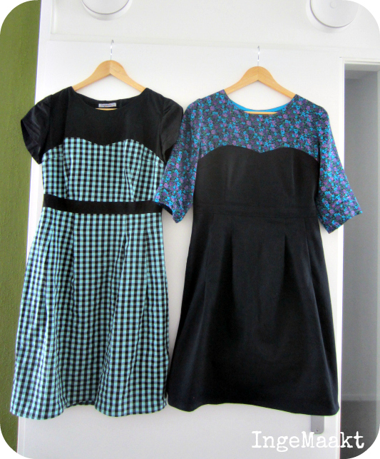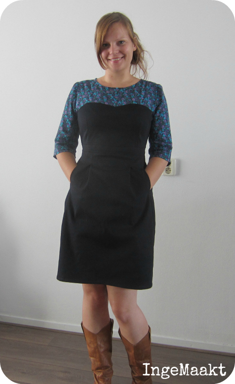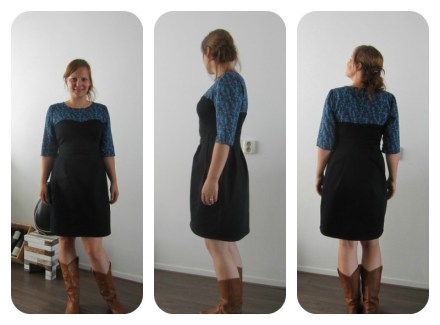 Ik ben blij dat ‘ie eindelijk af is, en trots op het resultaat. De zwarte stof is eigenlijk te zwaar voor het model. Maar er zit wat rek in en dat zit wel heel lekker. Het bovenste stofje is juist erg flutterig en dat voelt een beetje als een pyama. Waren al mijn kleren maar zo 🙂