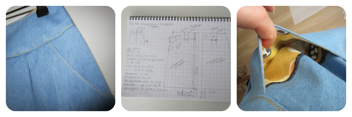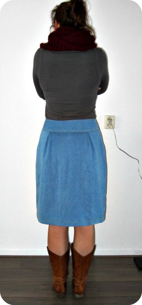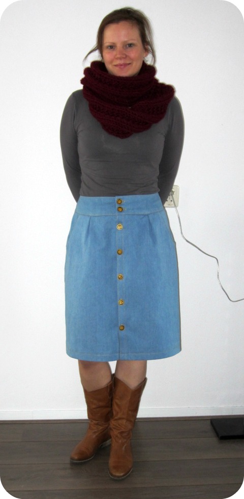 The fabric is a soft, lightblue denim. I bought it on the market here in Leeuwarden, it was the last bit. I paid 5 euro for 80 cm. With the tread and the buttons, this skirt cost me a lot of time and a little more than 10 euro’s. That’s a steal right?