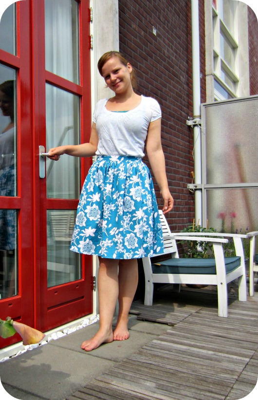 The previous skirt is made of cotton batiste, this time I used a ‘normal’ cotton, bought last year on a big fabric market that hits my town twice a year. I immediately liked it because it reminds me of a skirt I bought on holiday in France when I was a little girl. Ah, memories…
