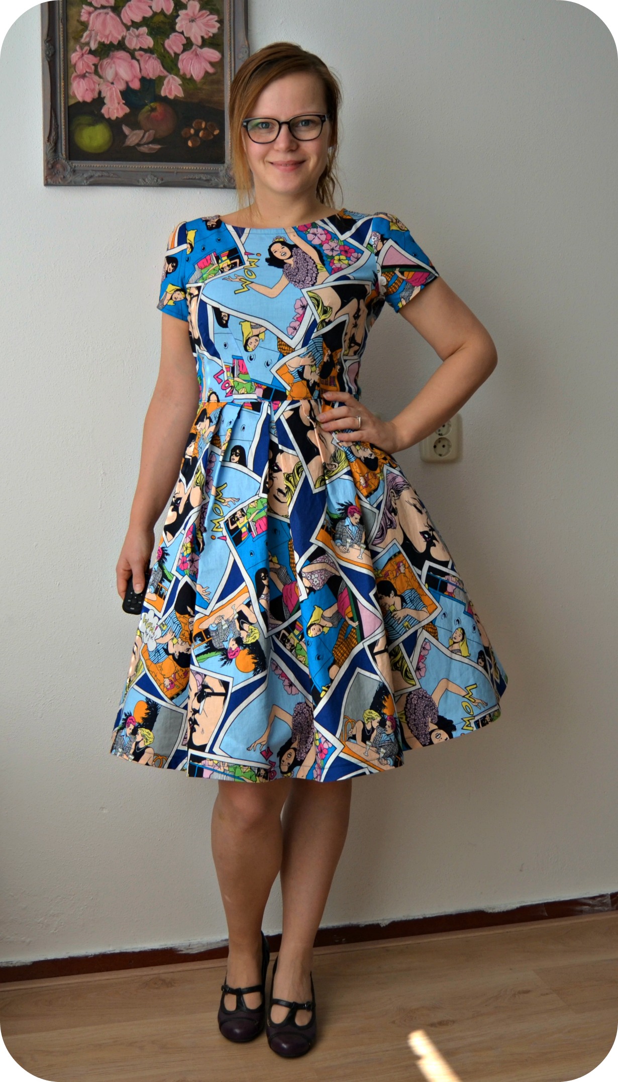 I bought this fabric at the local fabric store. The print reminds me of the ‘Ms. Tree dress‘ and the ‘Home sewing is easy‘. It consist of love scenes so I thought it was quite apropriate for the occasion.