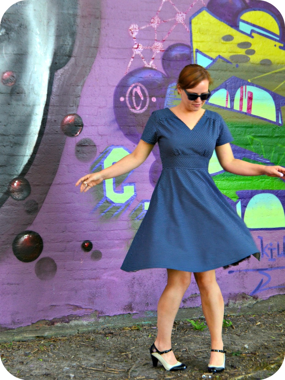 Woohoo, meer stipjes! Toen ik dit patroon bedacht wist ik meteen dat ik een blauw gestippeld exemplaar wilde maken. Dit patroon is geïnspireerd door de swing dresses uit de jaren ’40. Al sinds de Sew for Victory sewalong van Rochelle wilde ik een dergelijke jurk maken. Maar toen was ik nog niet zo enthousiast aan het patroontekenen begonnen, en ik kon ook niet hét patroon vinden. Maar uiteindelijk kwam het dus goed 🙂