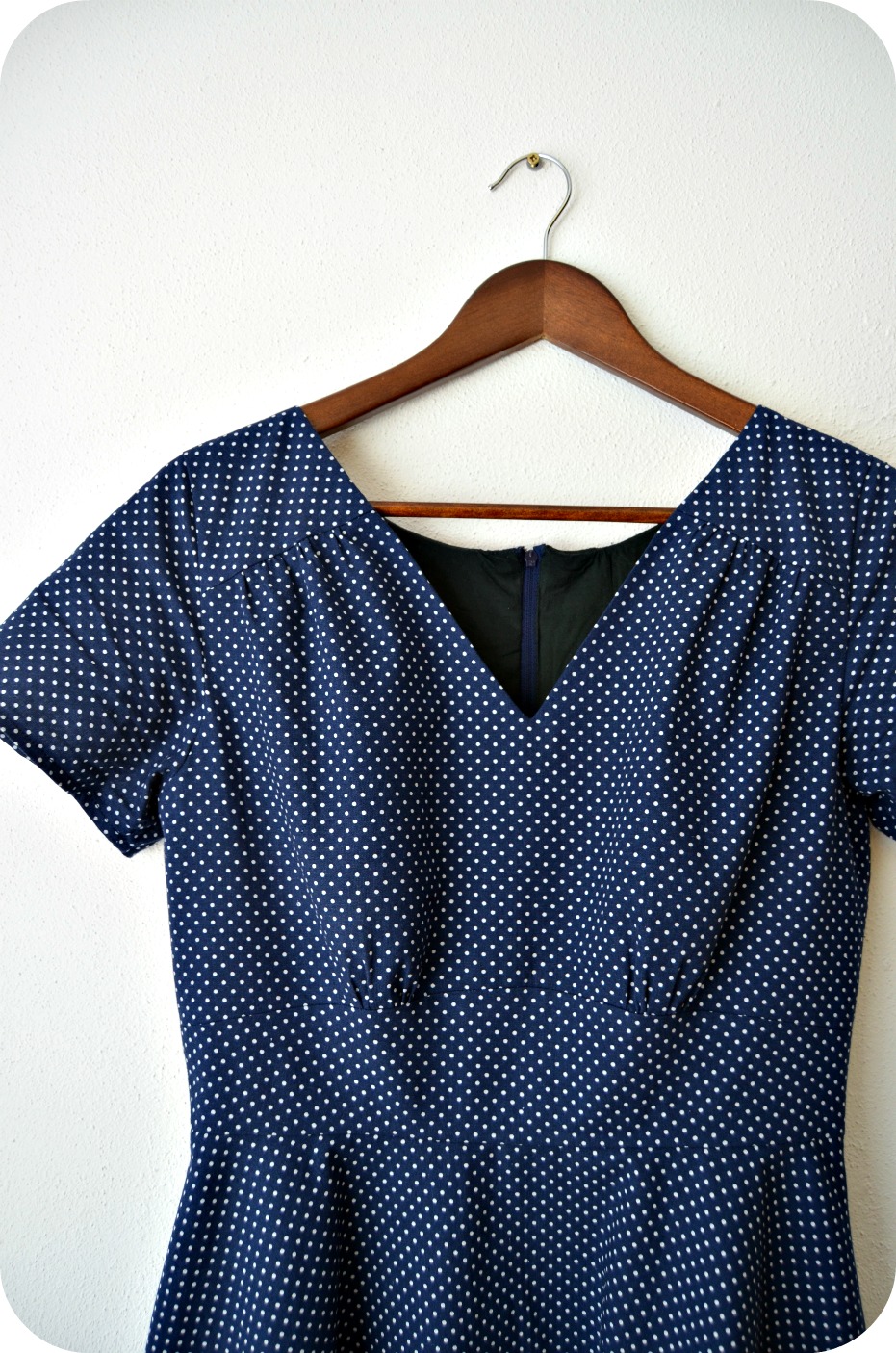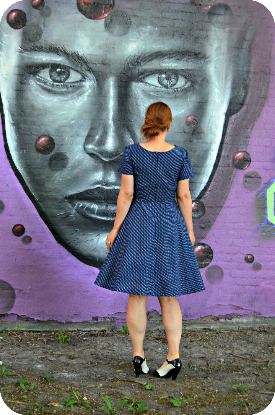 Woohoo, more dots! While making this pattern I immediately knew that I wanted to make it up in a blue, tiny dotted fabric.  The pattern is inspired by 40’s swing dresses. Ever since the Sew for Victory sewalong, hosted by Rochelle, I wanted to make a dress like this. At the time I wasn’t that into pattern drafting like I am now, and I also couldn’t find exactly the right pattern. But it all came together right now 🙂