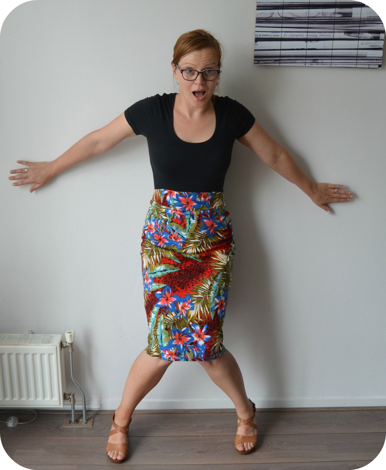 It’s a very comfortable skirt. Figure hugging but not too tight. And I LOVE the fabric, the bright colours, the flowers, the red panther print, fabulous!