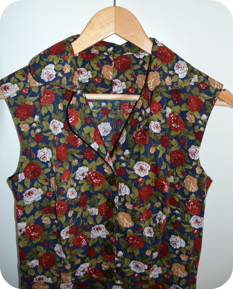 This picture shows the colours in the print the most accurate. I like how the buttons bring out the green in the print. Because the print is so busy the collar doesn’t really stand out, which is a bit of a shame since the collar was what I liked the most about Deborah’s dress. Ah well, can’t win them all I guess. I am pretty proud of the fact that my first ever self drafted collar worked out this well!