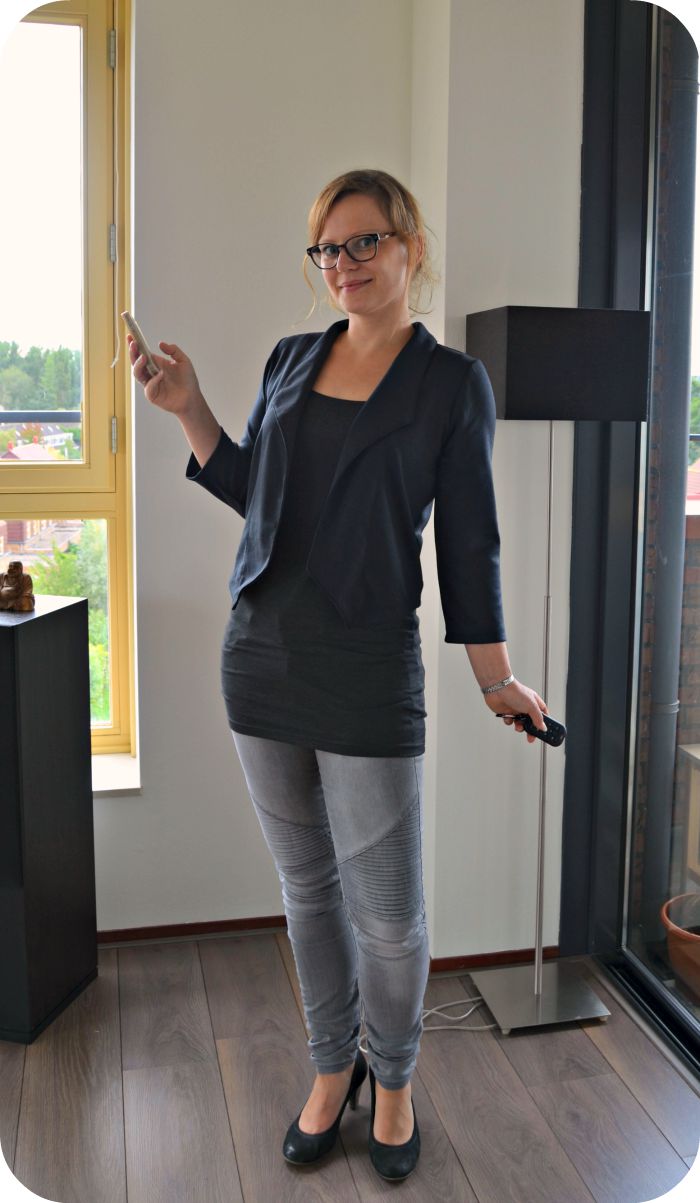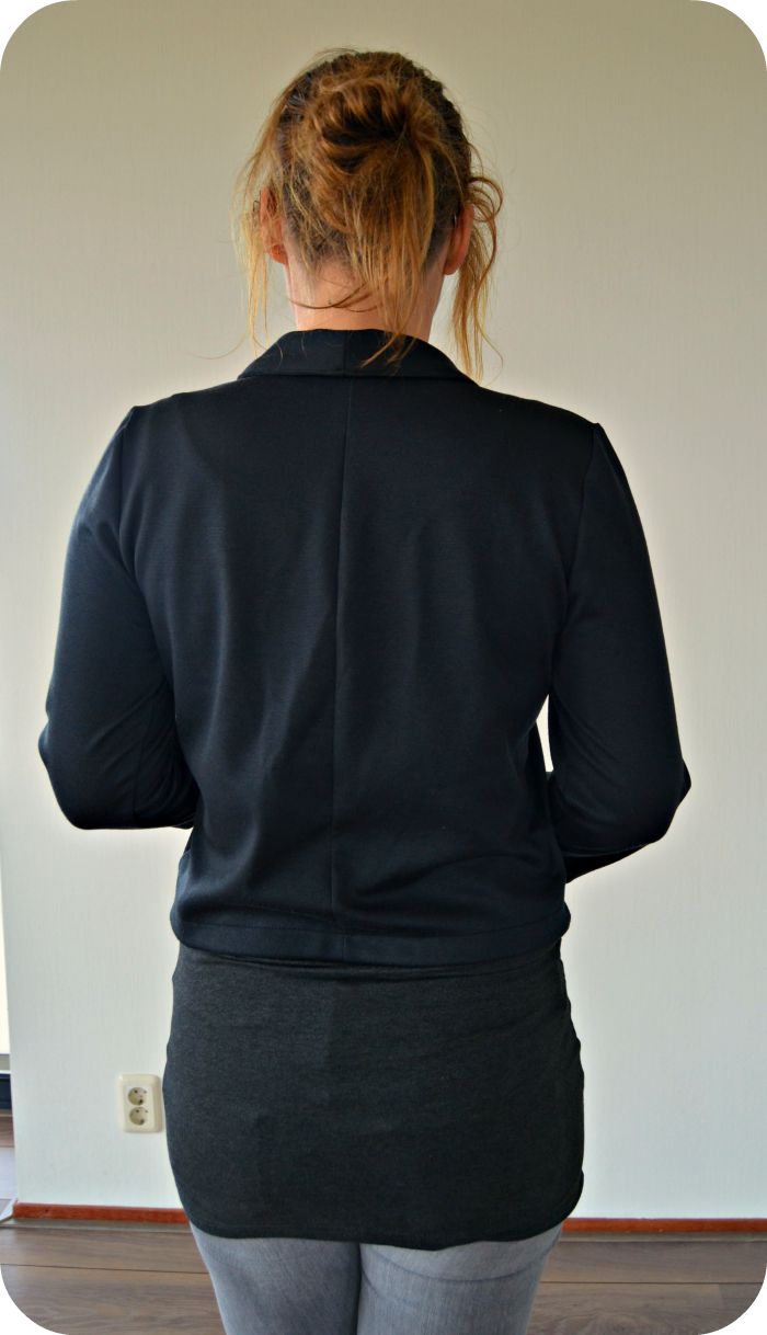 Al met al is de pasvorm nog niet perfect, zoals je hierboven ook kunt zien. Bij de oksels wat strak, en de rest lijkt wel te wijd. Desondanks ben ik heel blij met dit jasje. Gemaakt van zwarte ‘wintertricot’ is het net wat netter dan een vest, maar toch casual genoeg om me niet opgelaten in te voelen. Bovendien zit ‘ie heerlijk. Geen knellende mouwen of zweterige voering, geweldig.