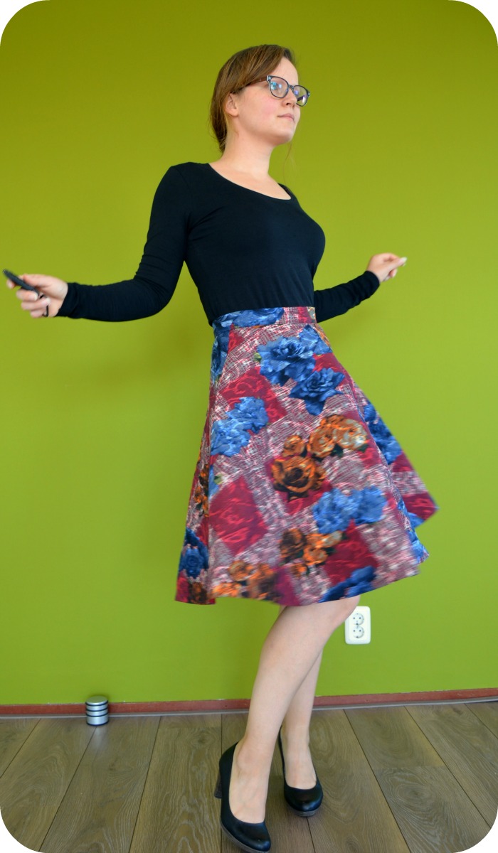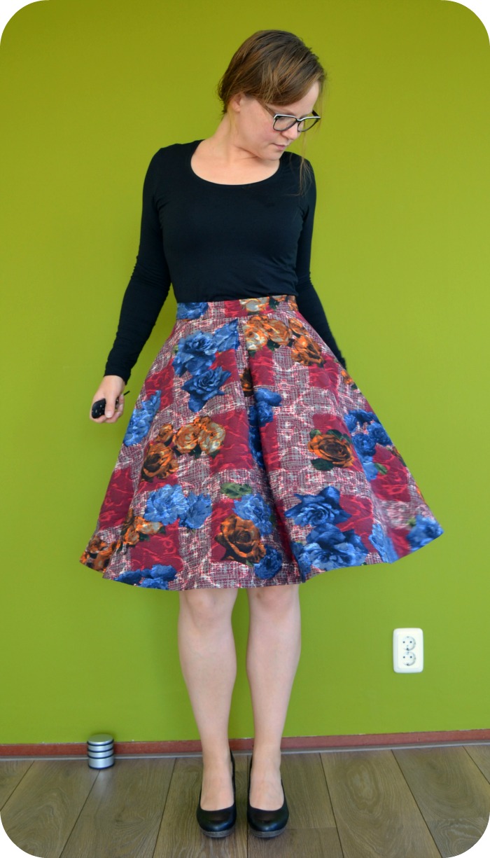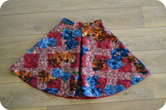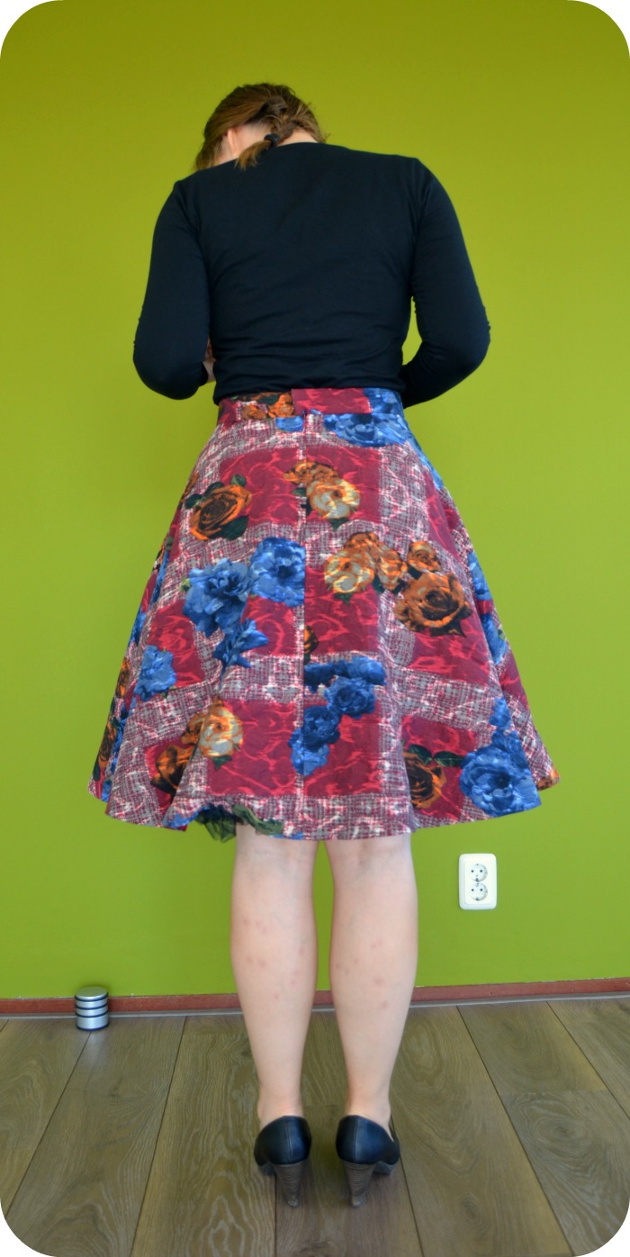 So I went for this fabric. I fell for the colours, the pink with the blue and orange flowers. I don’t really care for the plaids, but I hoped they wouldn’t be as abvious once it became a skirt. It’s a viscose mix, quite firm and with some stretch, most of it lengthwise. I had a last-minute idea to add an inverted pleat at CF. Everything else is just a regular half circle like on many dresses I made. I put on a straight waistband et voila.