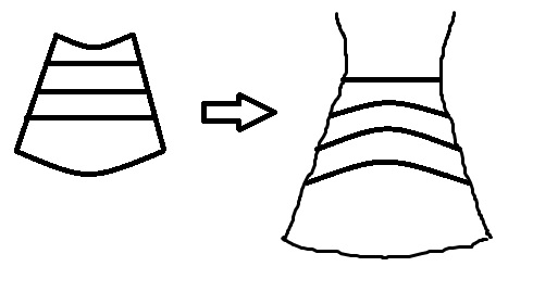 De stof komt van de Jan Sikkes hier in Leeuwarden. Deze maand hadden ze een aanbieding waarbij je bij aankoop van minimaal 5 meter stof 25% korting kreeg. Aangezien ik begin januari jarig was vond ik dat ik daar wel gebruik van mocht maken 🙂 Ik kocht deze stof met de Lady Skater in gedachten, maar omdat er een vrij duidelijke horizontale lijn in de stof zit zag ik daar toch maar vanaf. Door de vorm van het rokdeel krijg je dan namelijk dit effect en dat vind ik niet zo mooi: