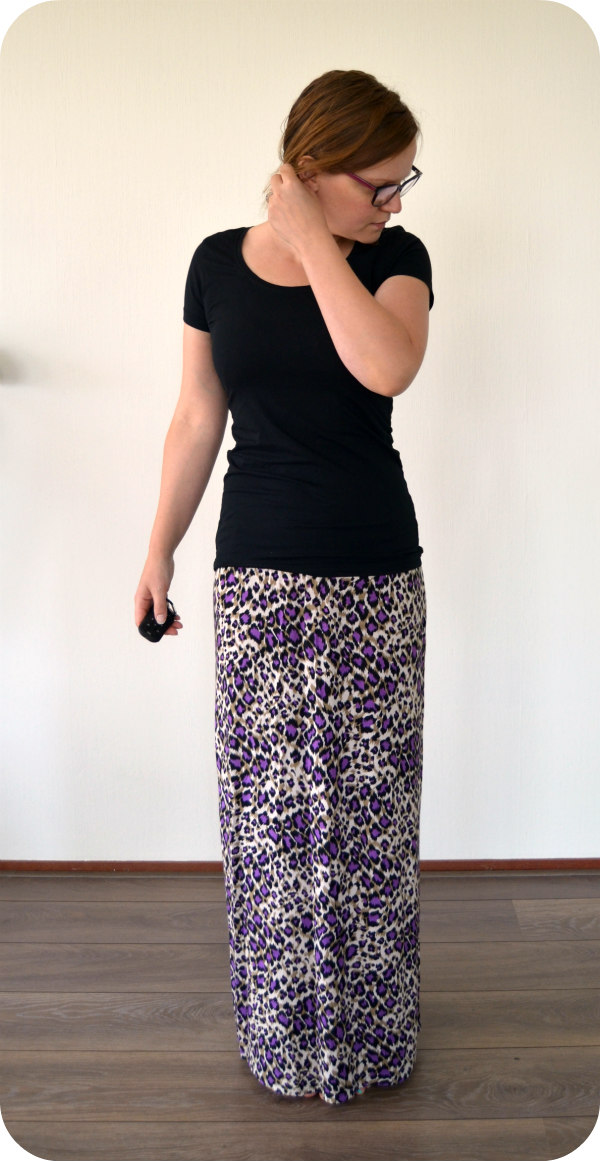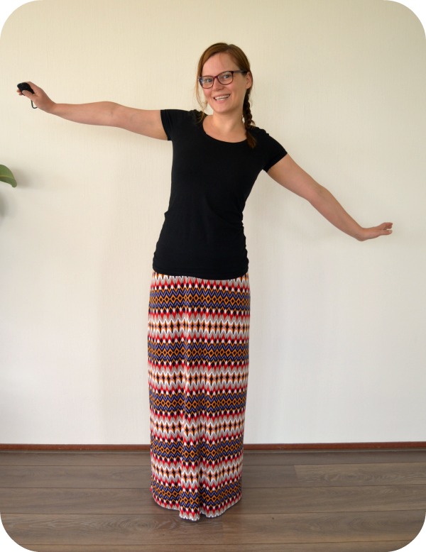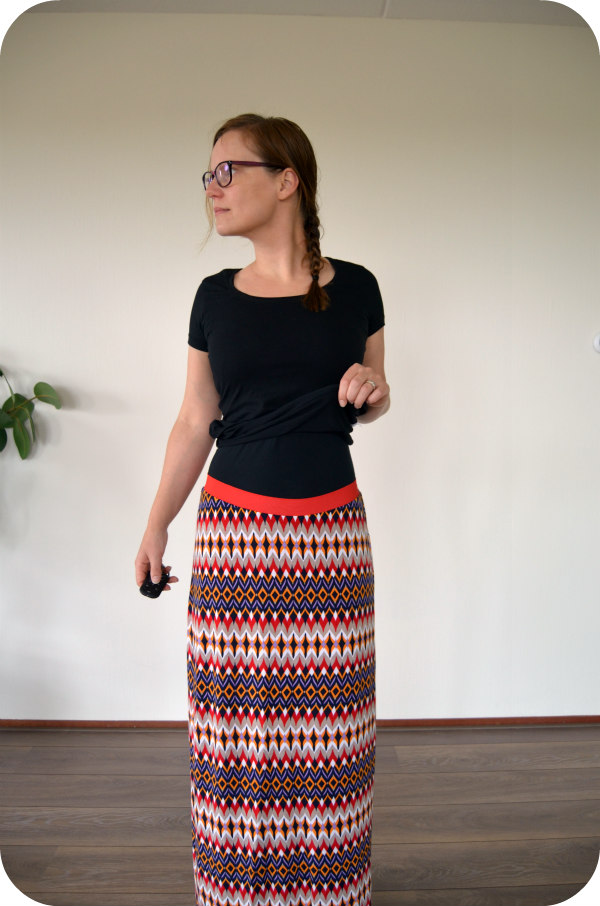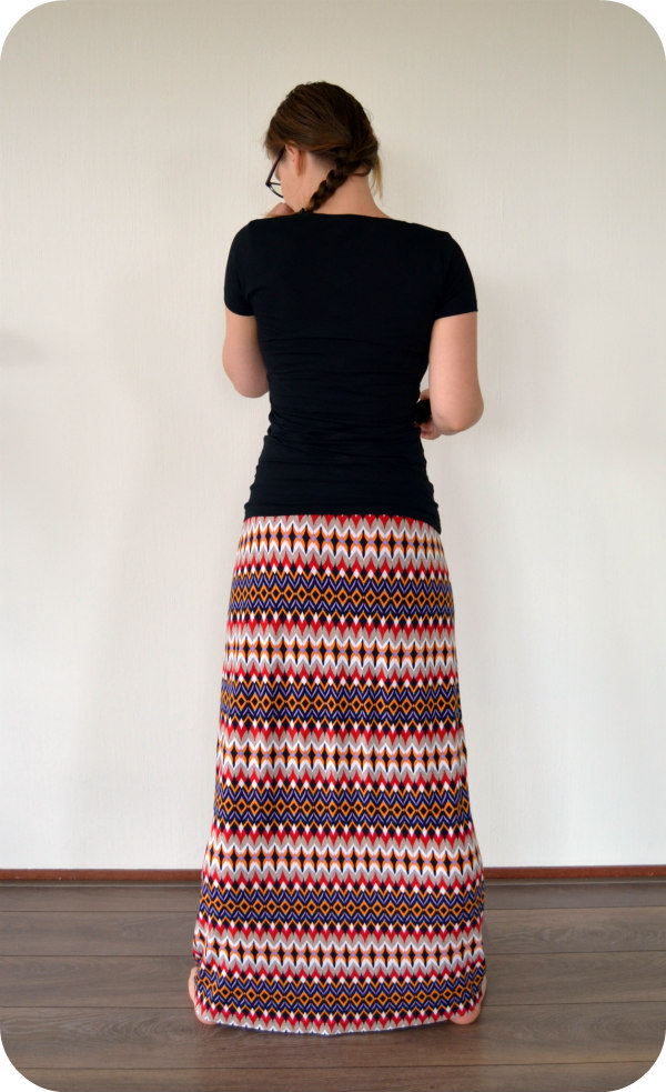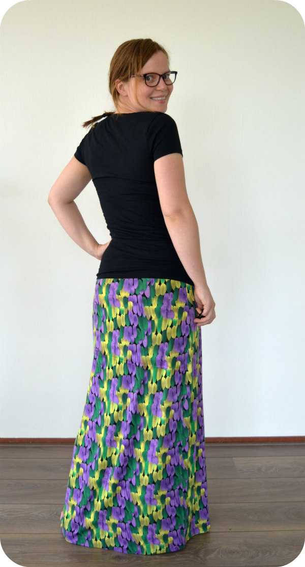 Twee jaar geleden maakte ik een maxi rok. Die draag ik nog steeds regelmatig. Zodra de zon schijnt en het is een beetje warm trek ik m uit de kast. Ideaal ook als het mooie weer je een beetje overvalt en je hebt je benen nog niet geschoren 🙂 Zo ook afgelopen donderdag. Toen realiseerde ik me dat ik er eigenlijk nog wel eentje wilde. Of twee, of drie, je weet hoe dat gaat. Vanaf het werk bestelde ik een paar viscose tricot stofjes zodat ik in het lange weekend lekker aan de slag zou kunnen. Vrijdag had ik ze al in huis, en op zondag ging ik er mee aan de slag.