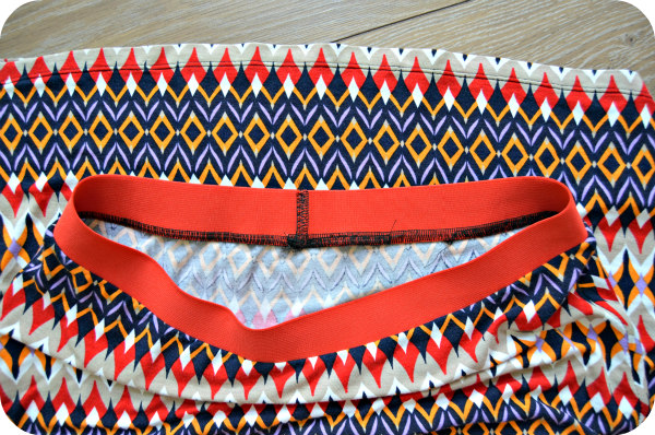 This one has a yoga-style waistband. It’s tight enough to wear it as is, but it can also fold over. Reality though is that I cut it a bit off grain and it doesn’t look good folded over.
