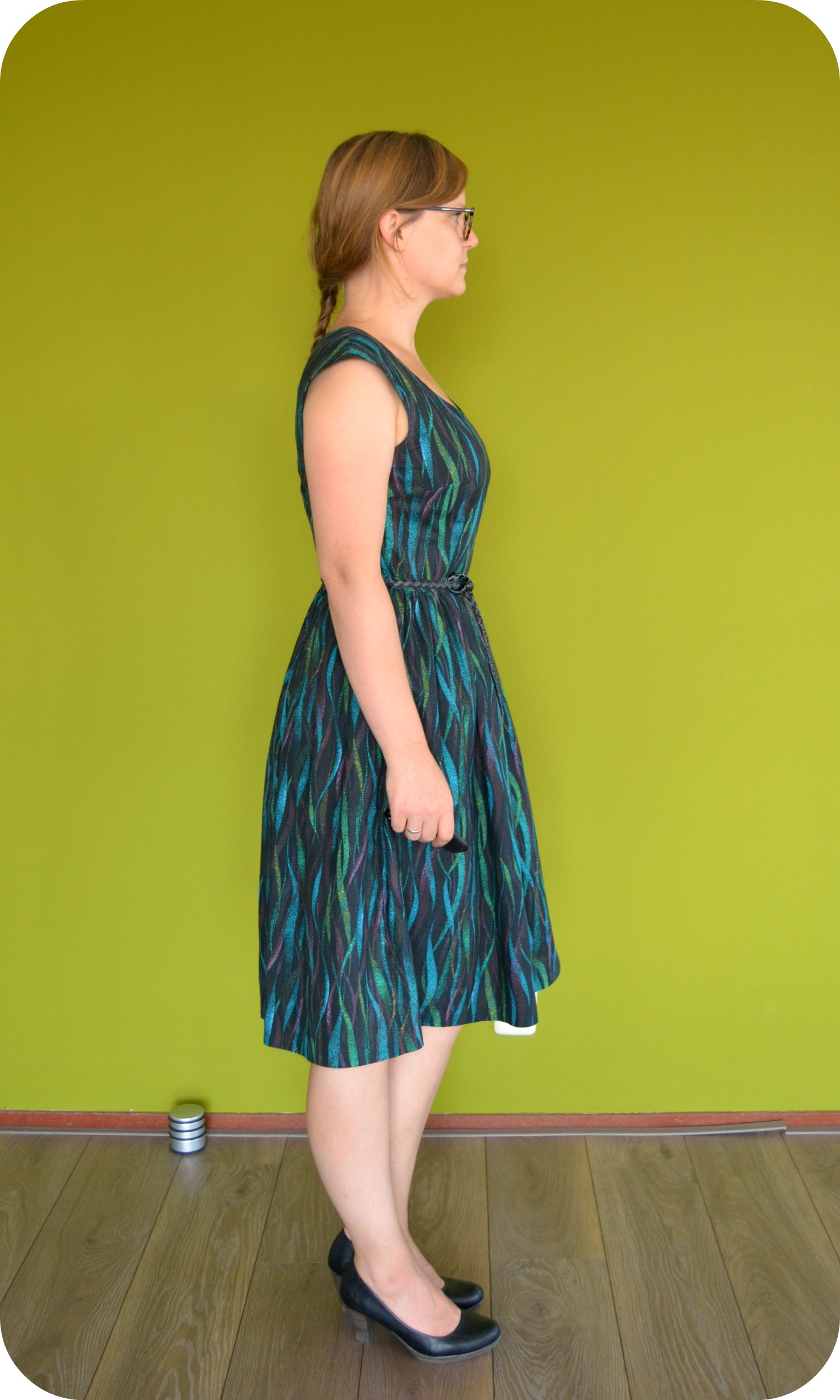 The bodice probably stretched a bit when sewing this dress. It’s a smidge wide at the waist and also a tiny bit too low. You can see it in the picture above, where the waist seam peeks out under the belt. I’m wearing the belt because of the slightly too wide waist and the gathered skirt: without the belt the skirt sticks out funnily at the front.