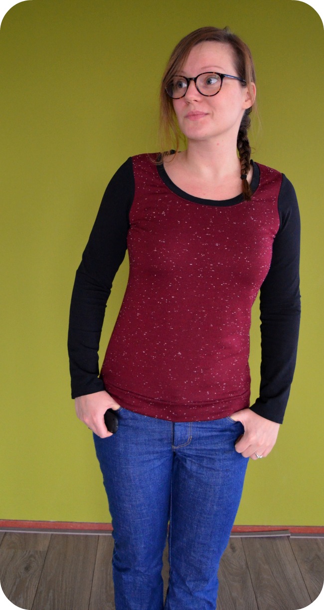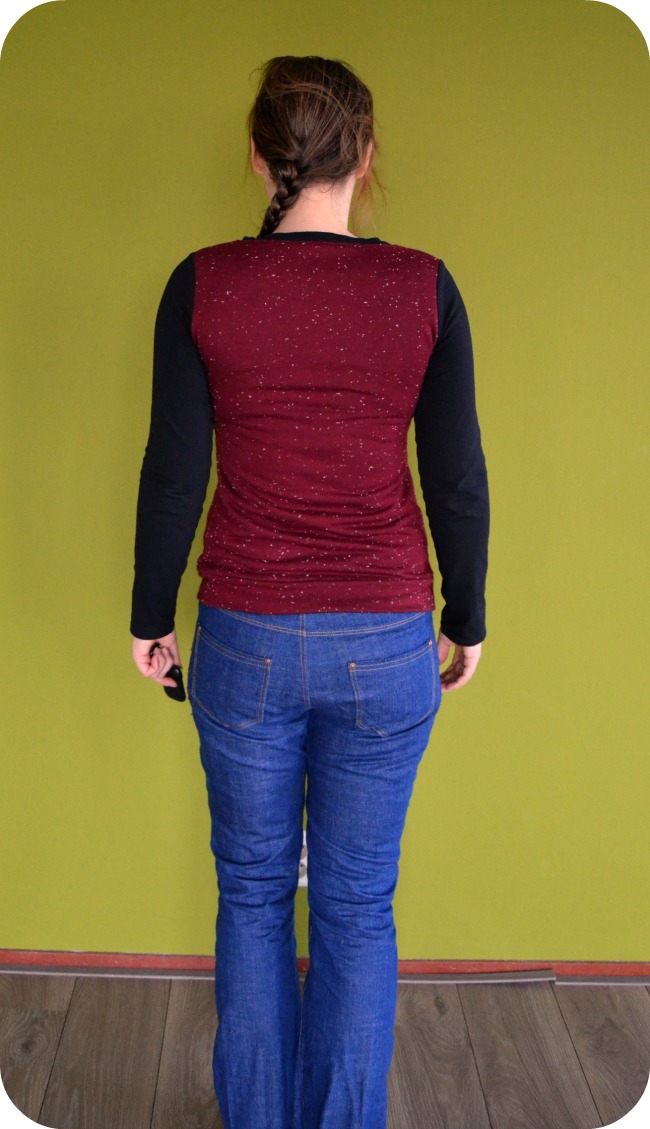I quite like the combination of fabrics. The fit I don’t like as much. As you can see above, it’s a bit tight at the upper back. This fabric doesn’t have much stretch, and while sewing this sweater I found out that the seam guide of my serger is actually at 1,5 cm from the right needle, instead of from the left. So where I thought I was sewing at 1,5 cm, I was actually sewing at 1,7 cm. That gave me almost a centimetre less in width, which would probably have prevented those upper back wrinkles.