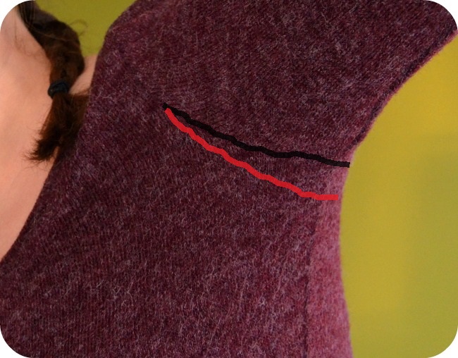 Nog steeds een te hoog armsgat, denk ik. De zwarte lijn is waar de naad zit, en de rode lijn is waar die ongeveer zou moeten zitten. Als ik mijn arm omlaag heb, loopt het bovenlijf door tot ongeveer 3,5 cm op mijn arm. Door de soepele stof merk ik dat niet, maar het is natuurlijk niet hoe het hoort.
