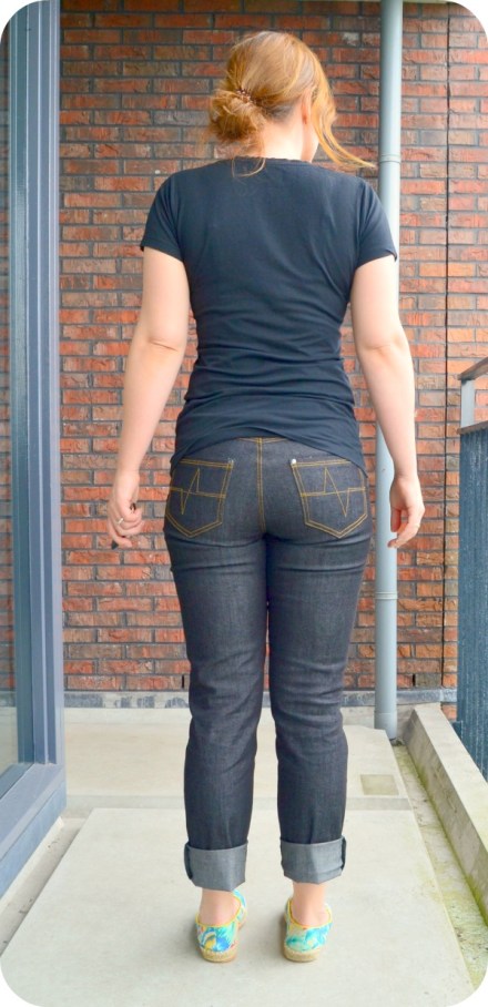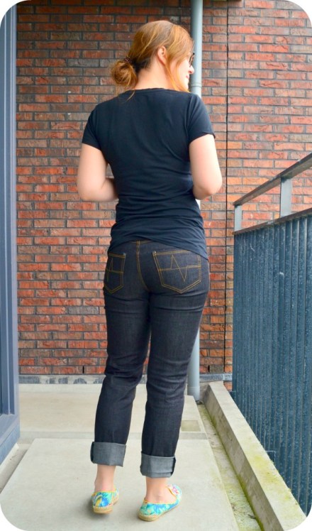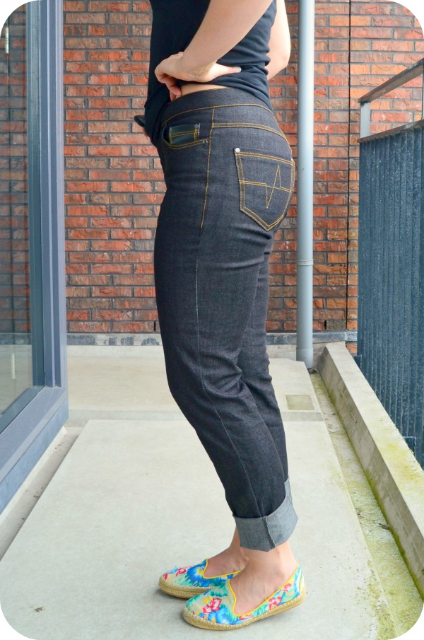The fabric I used is this black stretch denim. It’s a bit lightweight, but I thought that woul be nice for summer. Because this pattern is for non stretch denim, I took out some width at the side seams from halfway my tights up to the waist, 4 cm in total. This caused the back pockets to look a little wide set. Next time I’ll make this in a stretch denim I’ll center them one or a half centimetre.