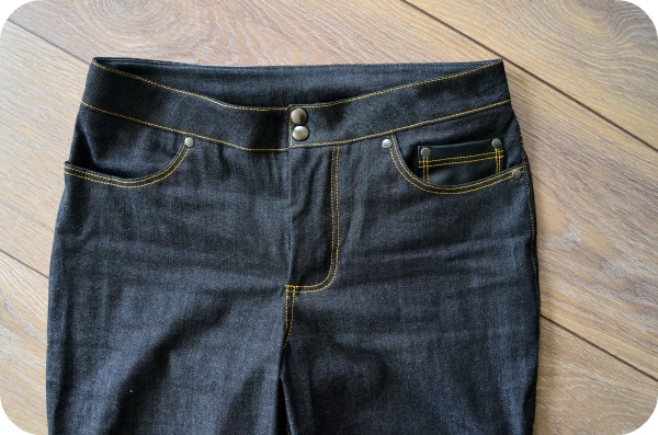 De stof is deze zwarte stretch demin. Een beetje aan de lichte kant, maar voor de zomer leek me dat wel fijn. Omdat het patroon voor een denim zonder stretch is moest ik hem vanaf de bovenbenen tot de taille wat innemen. Aan beide kanten een centimeter ongeveer, dus 4 in totaal. Zoals je hierboven ziet zitten de zakken daardoor een klein beetje te ver naar de zijkant. Mocht ik dit patroon nogmaals van een stretch stof maken, dan zou ik ze een hele of halve centimeter richting middenachter verplaatsen.