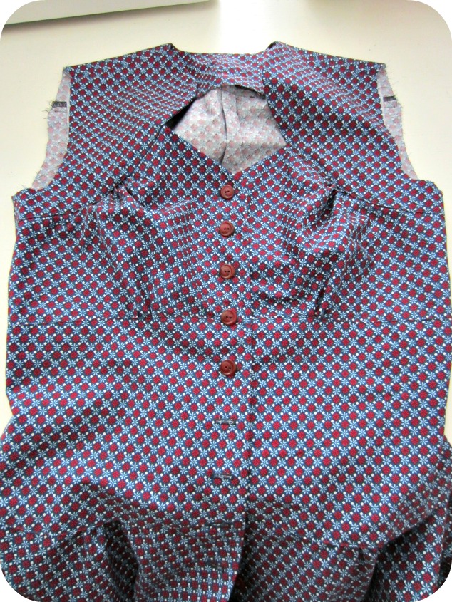 Right now I’m working on another Ceylon dress. I wanted to try something other than cotton this time, so I chose a dark red wooltouch fabric, made out of polyester and viscose, with black buttons and satin piping.