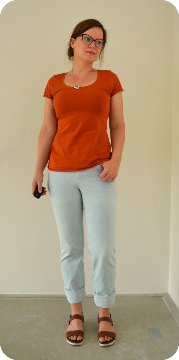 Het shirt maakte ik ook zelf. Ik was al een poosje op zoek naar een shirt of vest in deze kleur, maar ik kon het nergens vinden. Gelukkig kon ik wel stof in de goede kleur vinden, en het patroon maakte ik vorig jaar zelf in mijn zoektocht naar het perfecte t-shirtpatroon. Het trekt een klein beetje bij de oksels maar ik weet inmiddels hoe ik dat moet aanpassen. Verder is het niet gezoomd, ik vond het er wel leuk uitzien met die opgekrulde mouwen en onderkant, lekker casual.