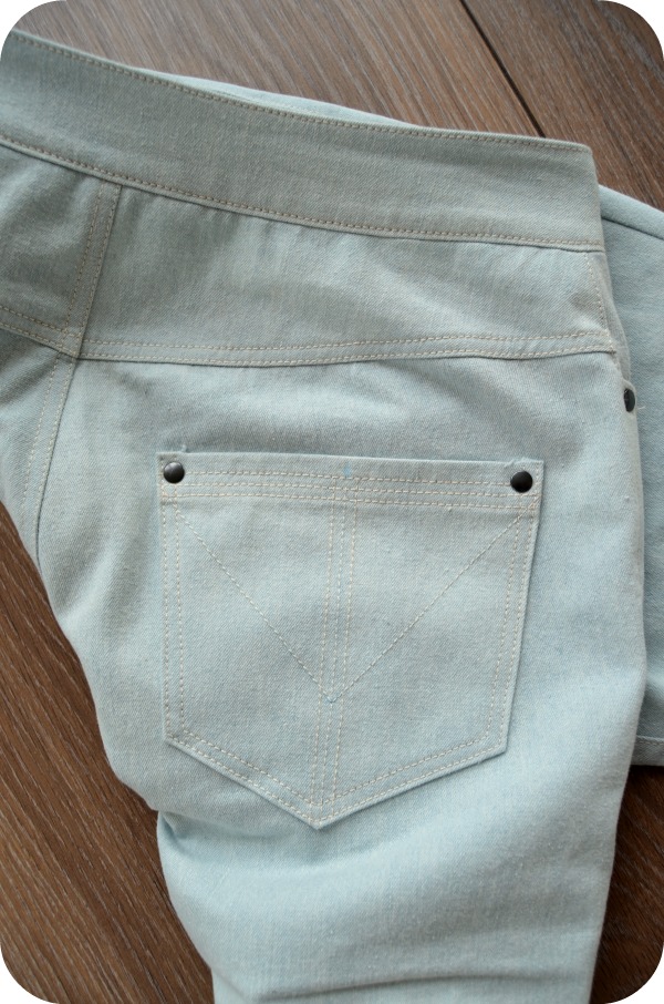 Getting good pictures of such a light fabric is a bit hard. These pics were taken as soon as I finished the jeans, it’s still quite tight. I intended them to be, because both my Morgan jeans and the other pair of non-stretch Sandra bag out quite a lot when worn. I hope this way it won’t show as much. The top of the waistband digs in a bit but hey, at least they won’t slip down 😉 I used the first method from this tutorial to reinforce the waistband and that worked beautifully.