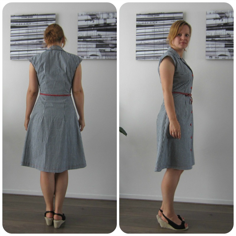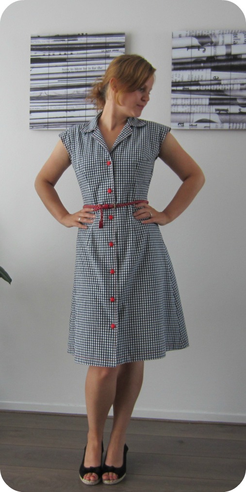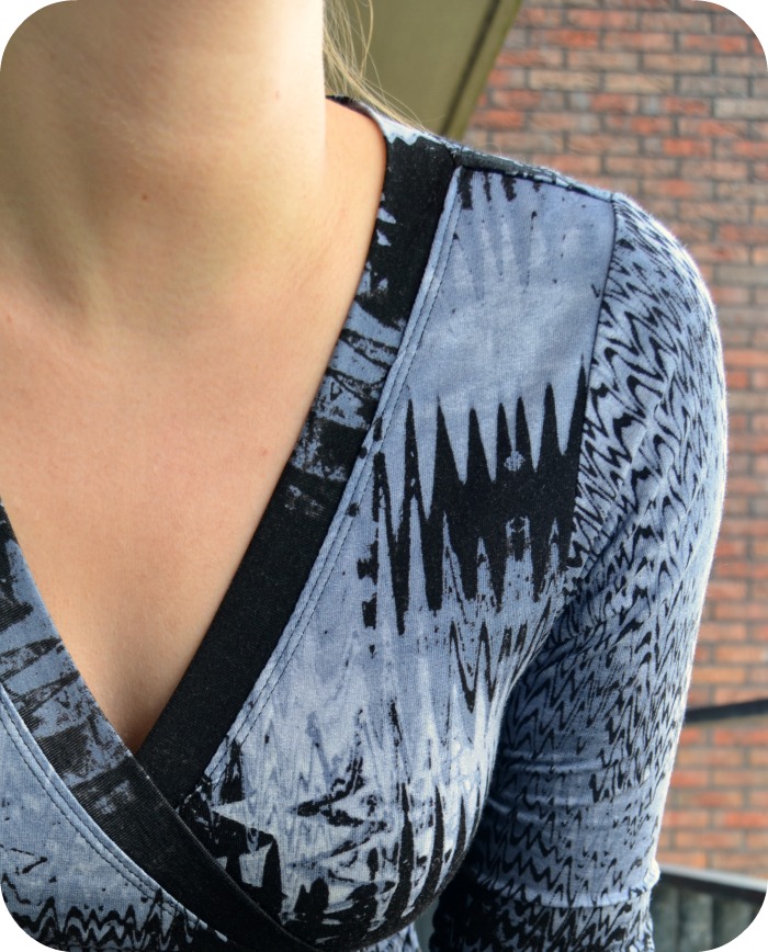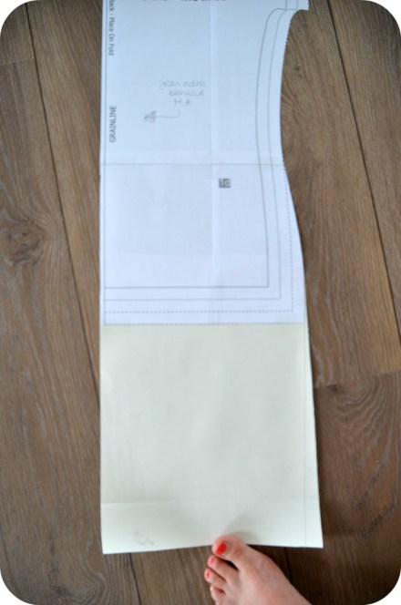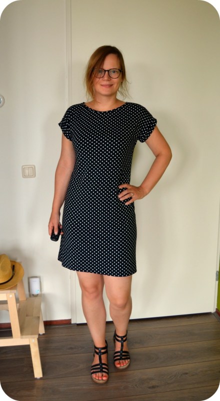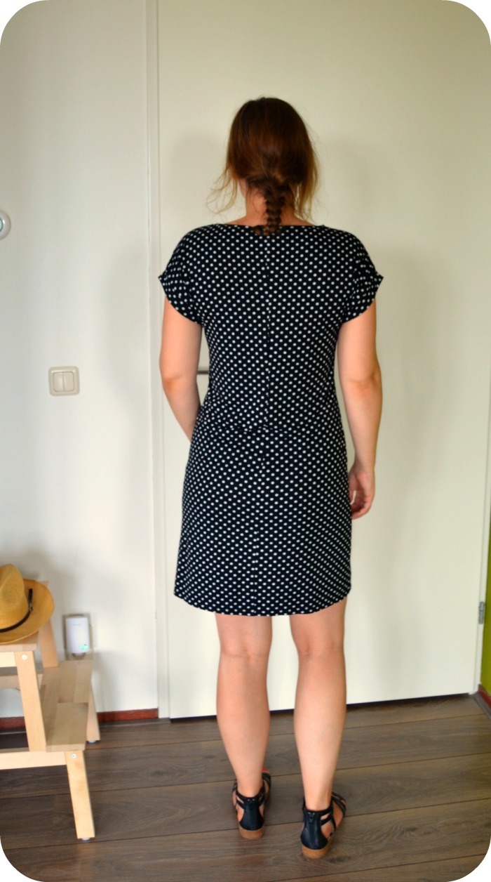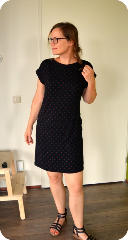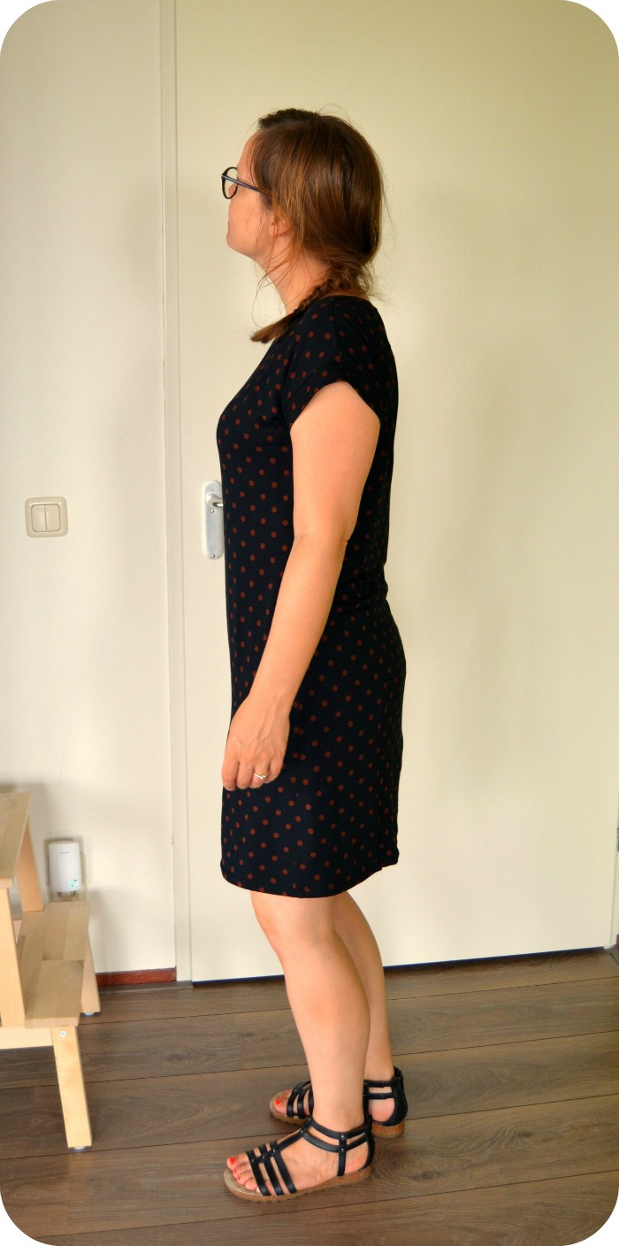 Untill last wednesday, the first day of vacation (yay!). I was thinking about those dresses again, in bed with some coffee and my laptop. I was browsing the H&M website to see if there were dresses that would fit the bill and suddenly I knew what to do. I had a half put together pattern of the Kirsten Kimono tee by MariaDenmark laying around, which I started taping together because I thought I had printed out another one of her patterns (how clever, ahem). There were only 3 A4’s to go so nothing I coulnd’t handle. I cut a size M and graded to an L at the hips for a casual fit. Then I lenghtened the pattern bij 27,5 centimetres and added 2 cm of width to the side seams at the hem for a little bit of flair. I also added a CB seam.