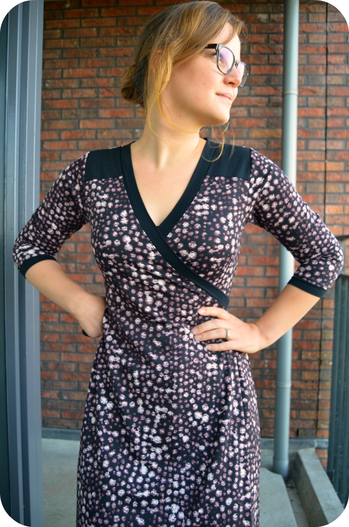 The first one is in a black viscose jersey with dark orange dots, which I probably bought somewhere as a remnant years ago. Deep stash baby! The sleeves are finished with a band, inspired by the Odette top from La Maison Victor (which was also a contestant as a pattern, but this one has more waist shaping, which I preferred). Everything is sewn on the overlocker except for the hem, which is coverstitched.