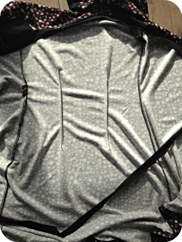 Vervolgens ging ik aan de slag met het volgende stofje: een hele zachte zwart-witte tricot. Volgens mij ook viscose, maar hij valt wat anders dan de eerste. Minder rek in de lengte en hij ‘plakt’ wat meer. Daarom moest ik deze een flink innemen op de rug. Laat ik daar nou precies die middenachternaad voor hebben toegevoegd 😁