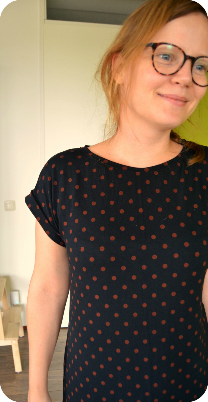 Het eerste exemplaar is van een zwarte viscose tricot met donkeroranje stipjes, ik geloof dat ik die ooit eens als couponnetje heb gekocht ergens. Jaren geleden al. Deep stash hier beste mensen! De mouwtjes zijn afgewerkt met een bies, afgekeken van de Odette uit de La Maison Victor (ook een kandidaat als patroon voor deze jurkjes maar de Kirsten Kimono tee is wat getailleerder). Alles is verder met de lockmachine genaaid behalve de zoom, die deed ik met de cover.