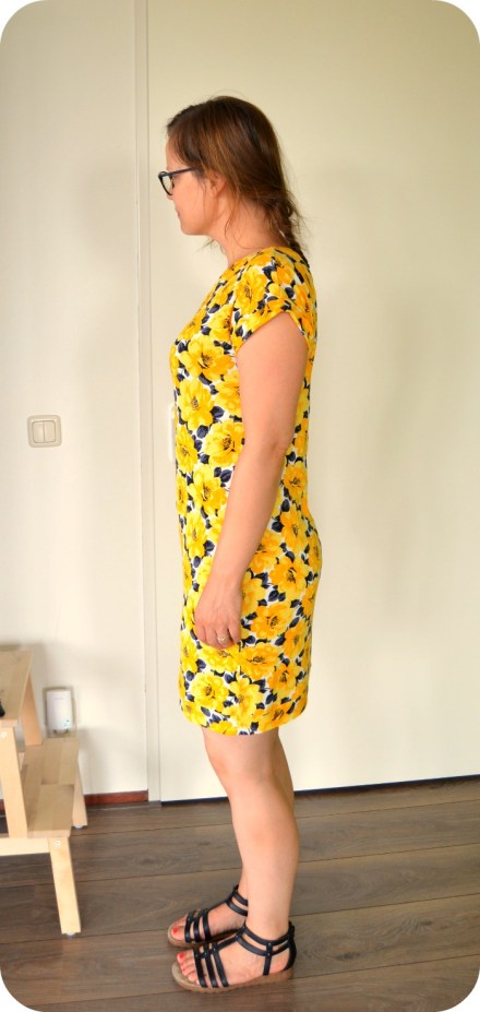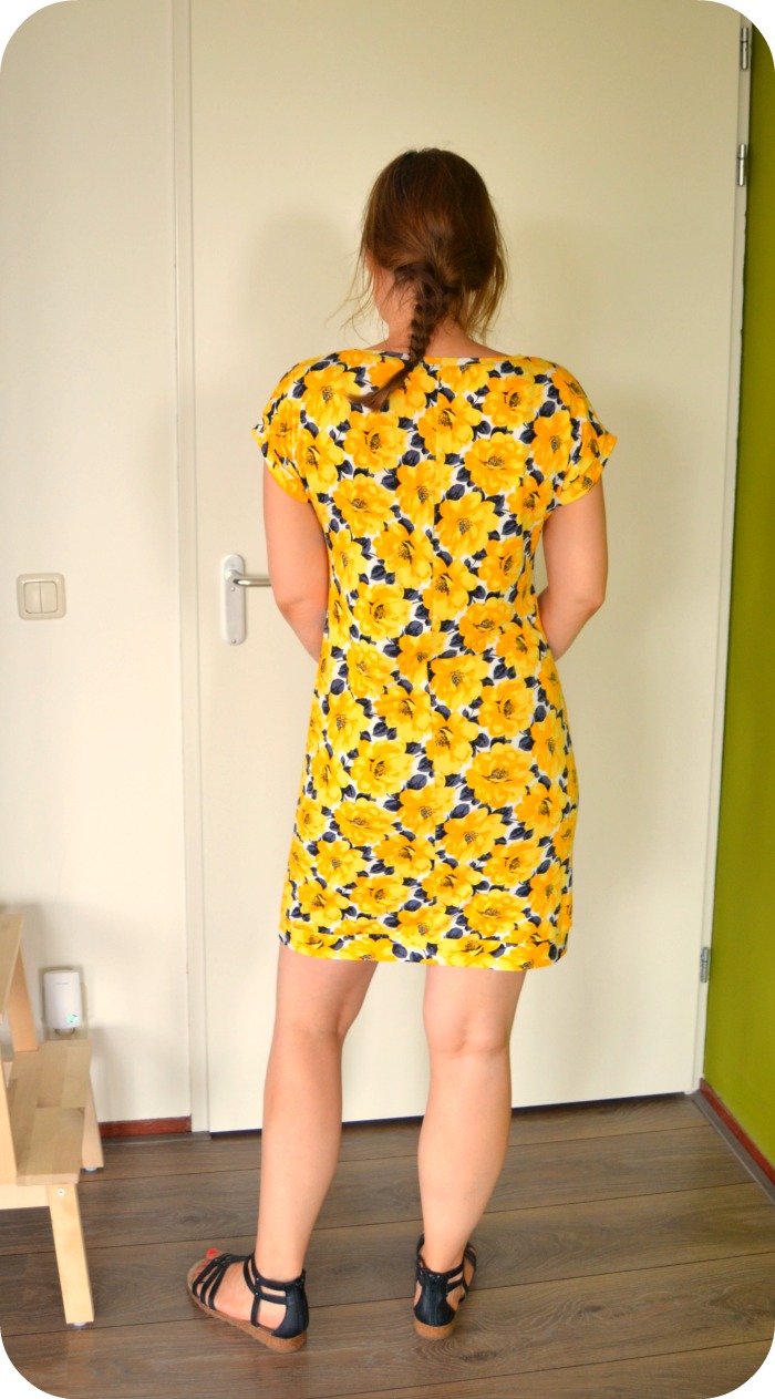 Then the fabrics I had in mind were finished, but I had the energy to make another dress. So I went to my stash and took out another viscose knit, with yellow flowers. I had bought this last year to make it into a maxi skirt, but after I had made one for my sister-in-law, there wasn’t enough fabric left. There was juuust enough for this dress if I shortened the hem a bit. After cutting it turned out that I could also cut a hem band, when cutting it lengthwise. Luckily the fabric has enough lenghtwise stretch to make that work.