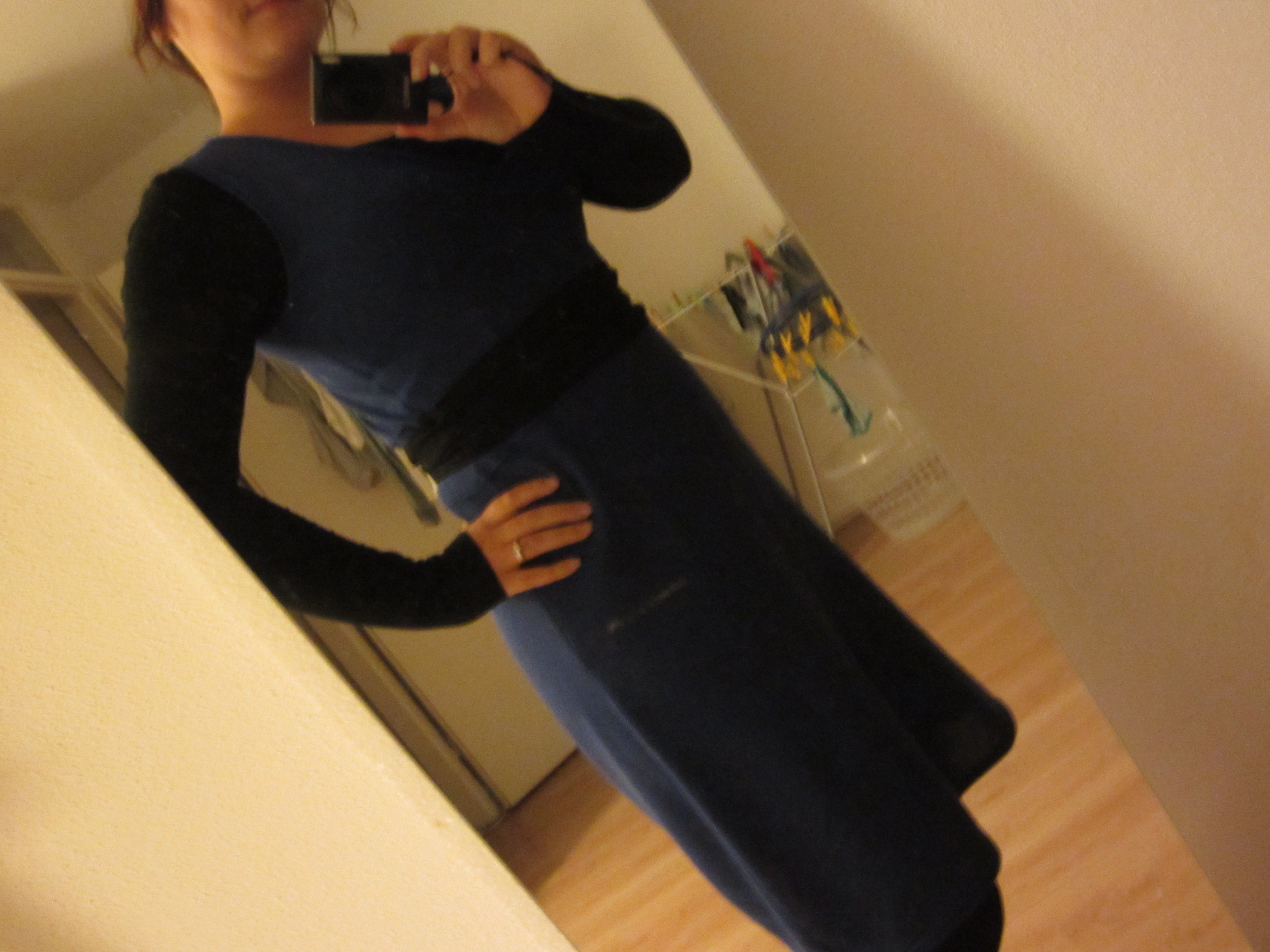 Nou ja, veel zie je er niet van. Het is een soort nep-wikkeljurk, wel mooi geworden maar er moet nog e.e.a. worden aangepast. Ik wil hem nog ietsje korter maken en het viel mij opeens op dat de ene mouw wel iets van 3 cm verder van de hals is aangezet dat de andere. Dat lijkt een beetje raar, en moet dus anders. Maar nu nog tijd&zin maken, want iets nieuws beginnen is natuurlijk leuker dan iets ‘oud’ weer aanpassen!