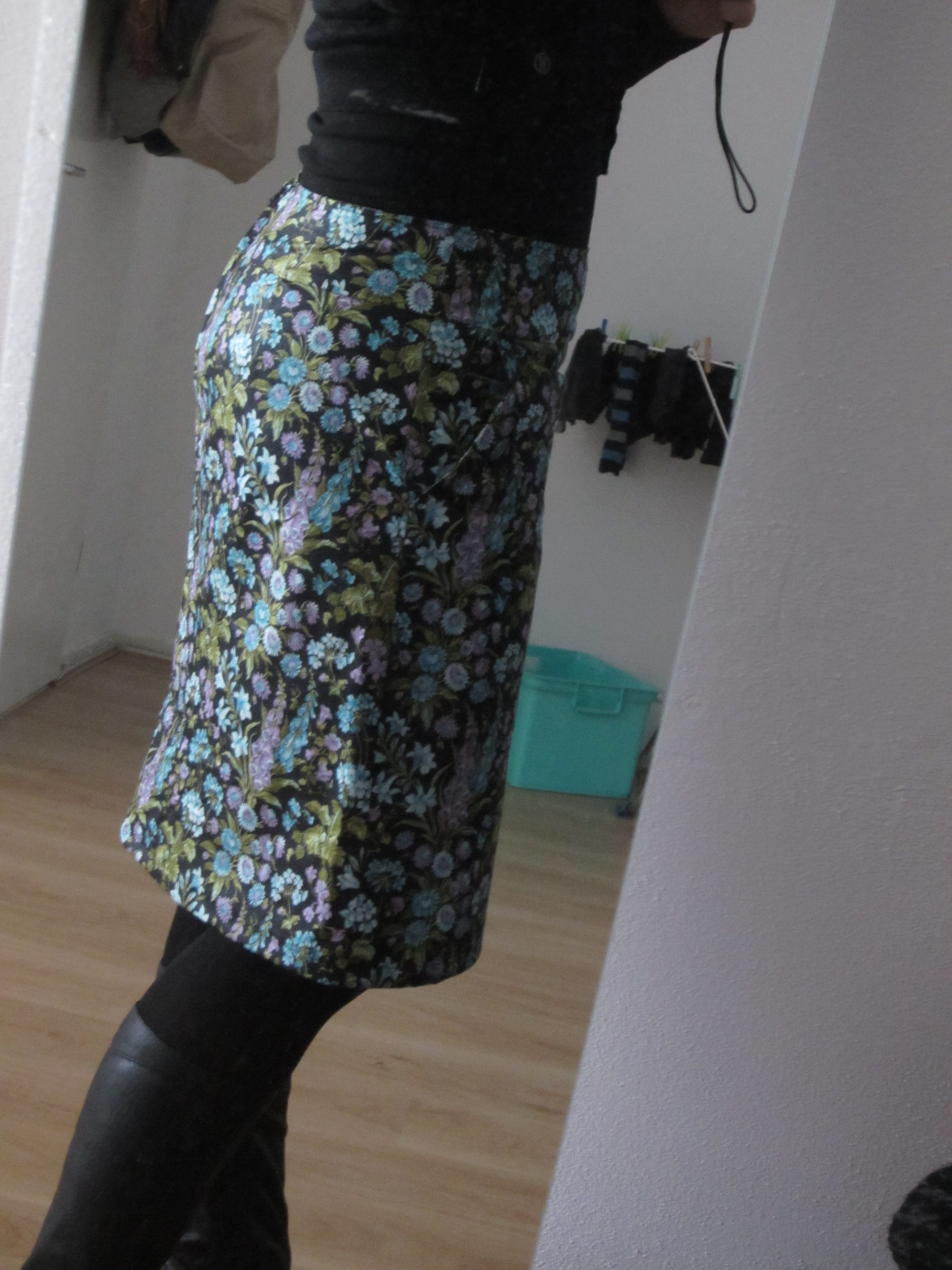 Het modelletje, een simpel A-lijn rokje, komt uit de Knip van juni 2010 of 2011, dat weet ik zo niet meer. Ik maakte hem een maatje te groot zodat de tailleband op mij heupen rust i.p.v. in te taille, dat vind ik lekkerder zitten. De zakken nam ik over van een ander rokje, want zakken zijn zo fijn.