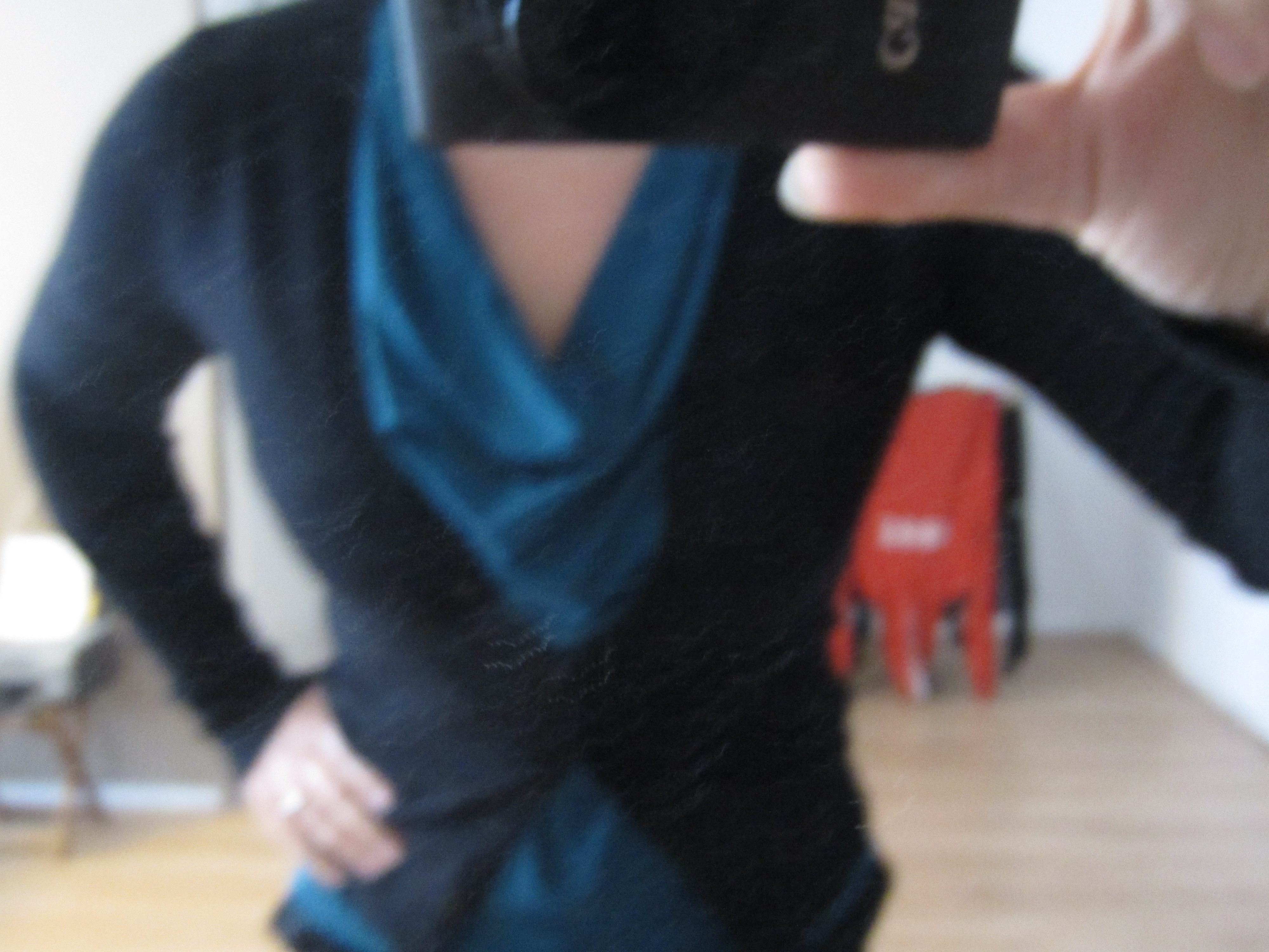 Nou, dat waren even heel wat foto’s in één post! Dan ga ik nu weer vrolijk verder, met een jasje in de naailes (want: moeilijk!!) en thuis een makkelijk tricot shirtje met een watervalhals, in dit kleurtje: