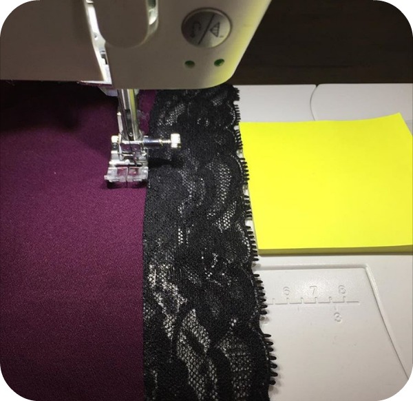 This is how I do that: with a stack of post-its as a guide. The lace is right side down and so is the fabric. It’s sewn with a zig-zag stitch and the lace is stretched slightly while sewing. To get a neat finish I changed the order of construction a bit. After sewing the front crotch seam I apply the lace and then sew the back crotch seam. Because of the shape of the crotch gusset that’s easy to do, and it gives a nice flat finish at the front.